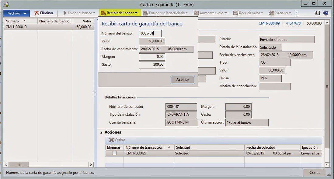 Luego de enviar al banco se habilitará el botón de Recibir del banco donde se ingresa el numero de contrato con el banco y el importe de la comisión y margen de la carta de garantía como se muestra en la siguiente imagen.